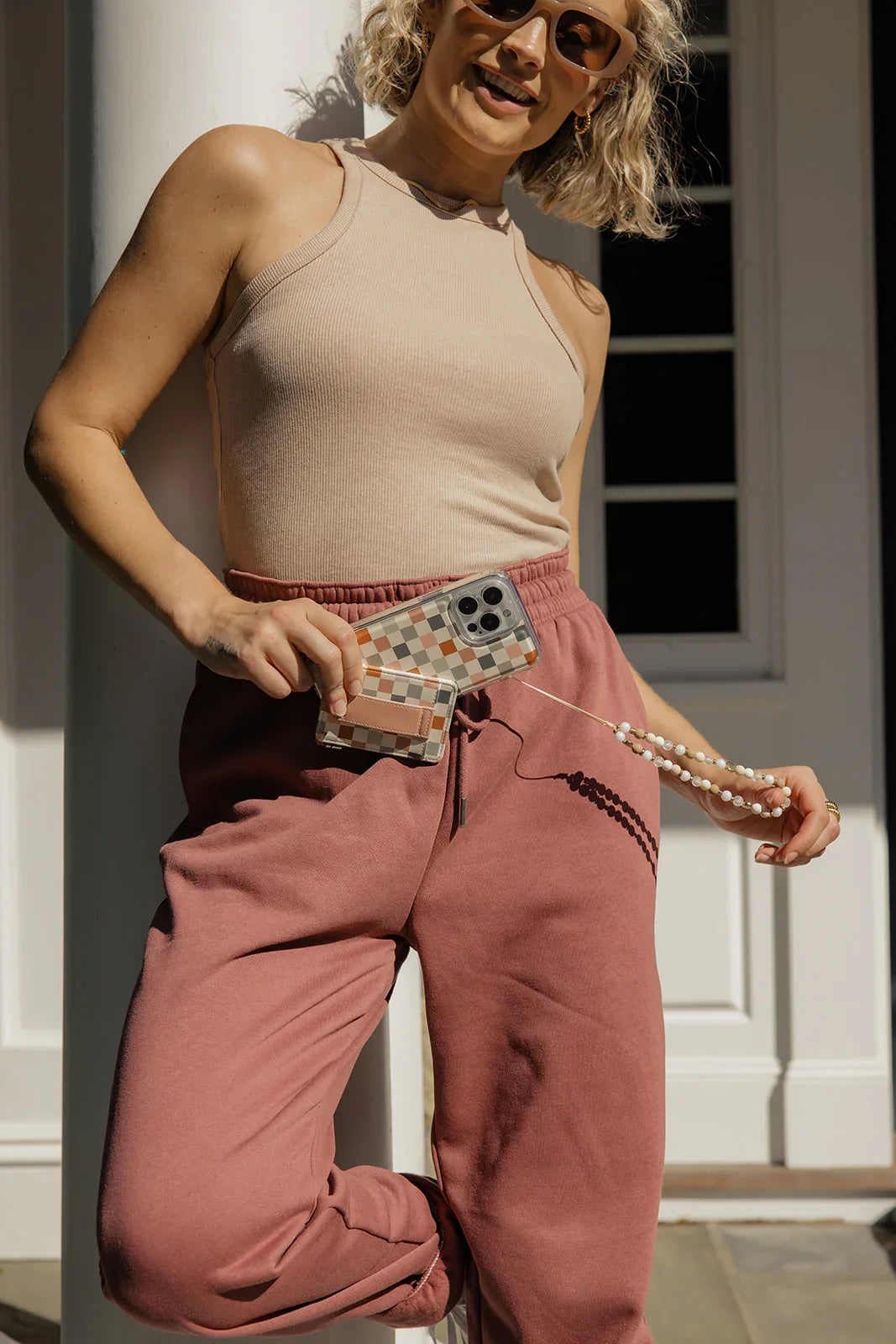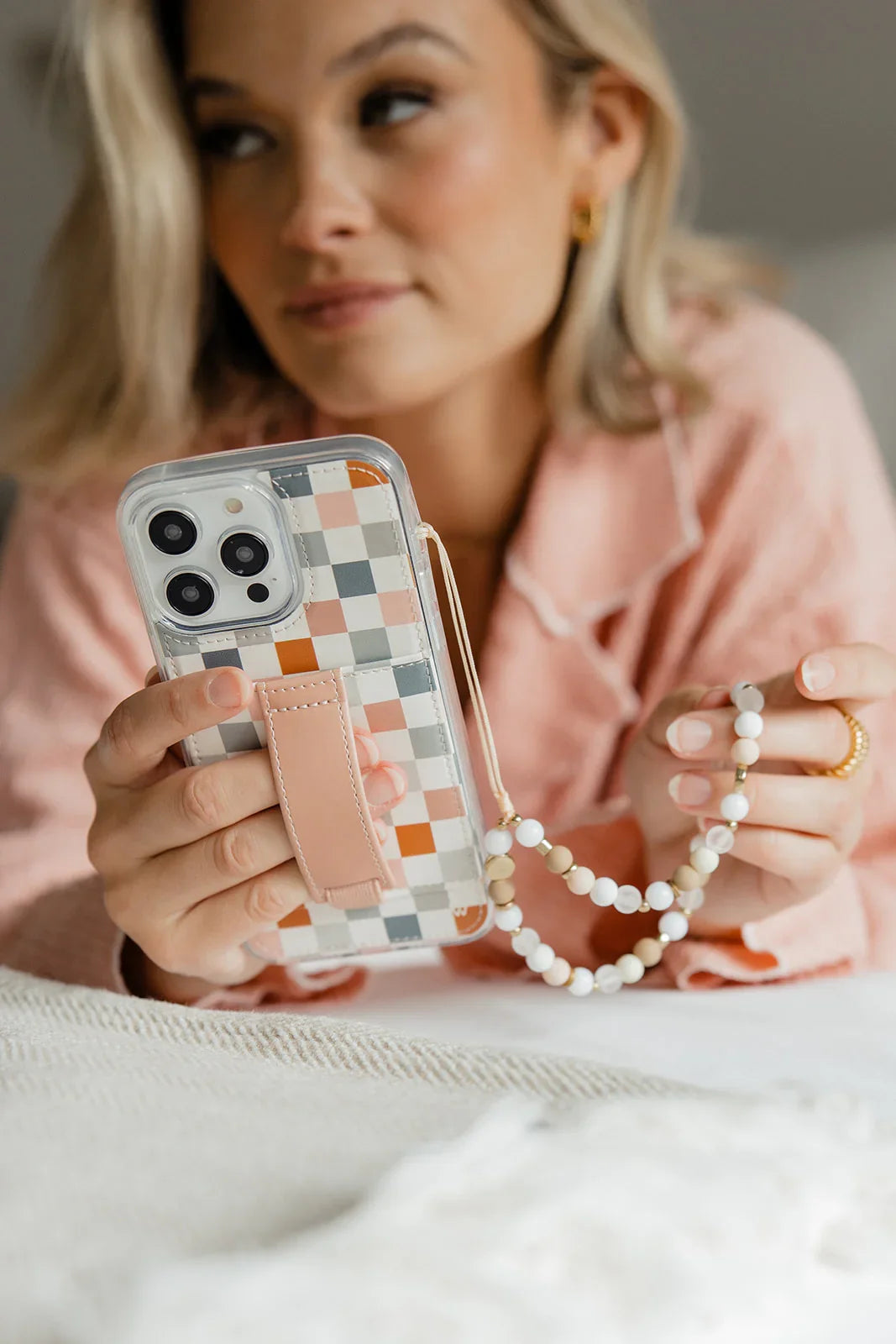 Add this neutral beaded wristlet to your Walli Case for hands-free carrying!