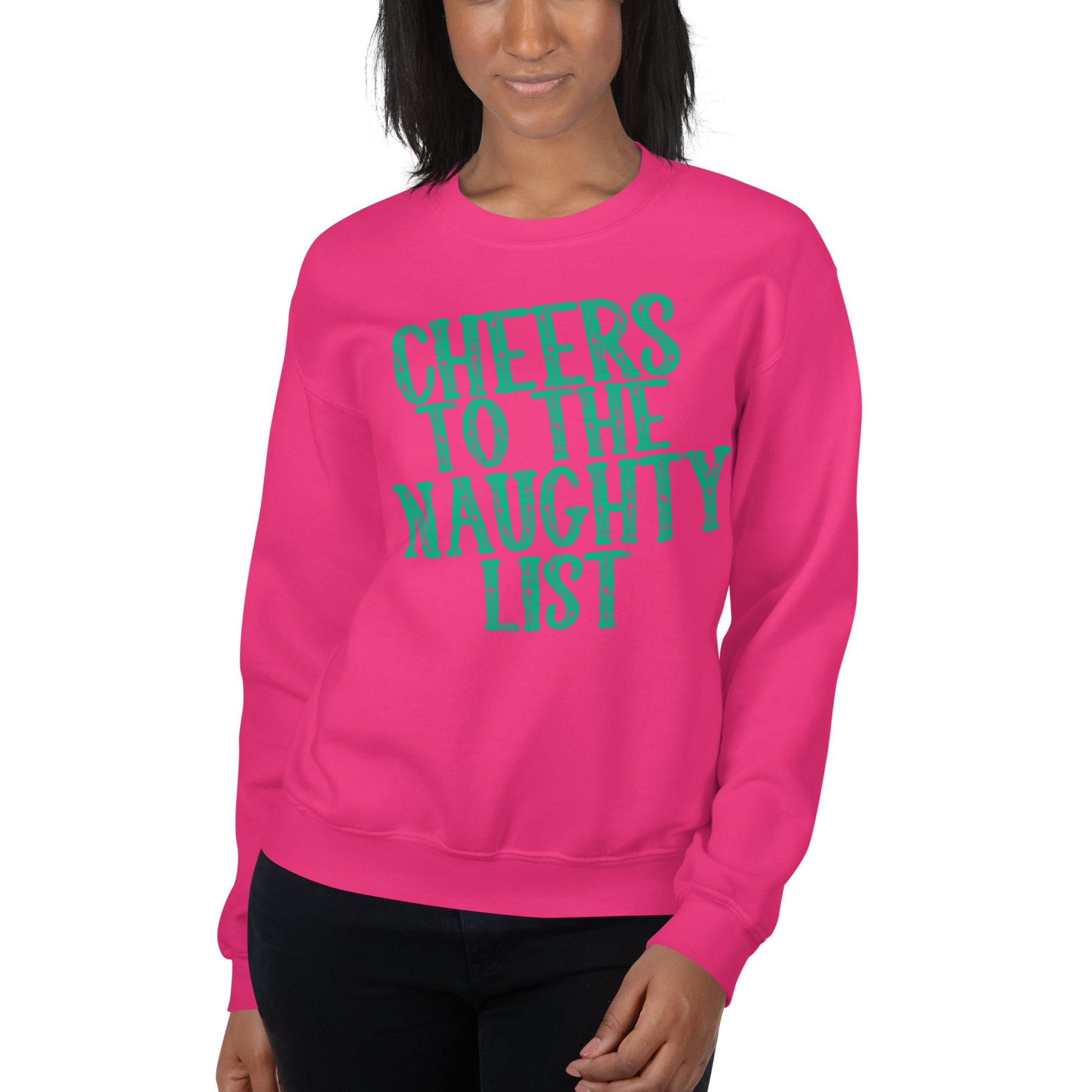 Bring the sass to the holiday season with this bold and playful “Cheers to the Naughty List” sweatshirt! Perfect for Christmas parties, girls’ nights, family get-togethers, or anyone who loves a little festive mischief. Bright, cozy, and impossible to ignore — this is the holiday sweatshirt that brings all the laughs.